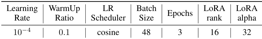 The the the table lists the hyperparameters used for training the LLMs with LoRA. These settings include a learning rate of 10^-4, a cosine learning rate scheduler, a batch size of 48, three epochs, and LoRA parameters with a rank of 16 and an alpha of 32. The training uses a cosine learning rate scheduler and a batch size of 48. LoRA is employed with a rank of 16 and an alpha of 32. The model is trained for three epochs with a learning rate of 10^-4.