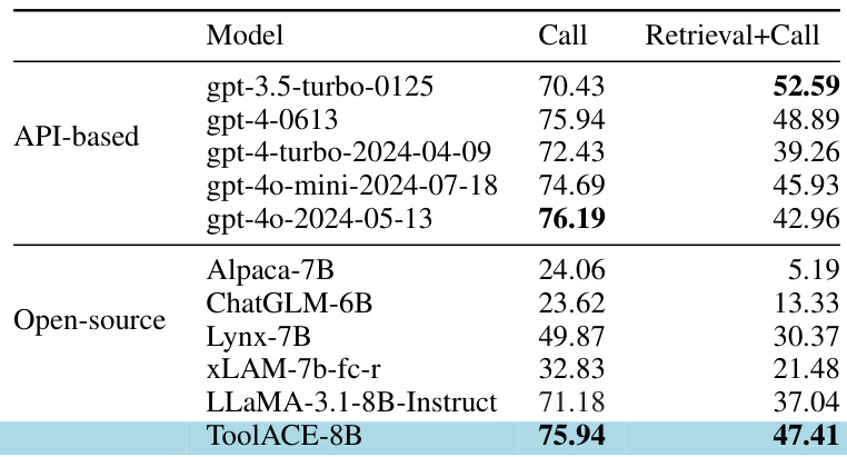 The authors compare the performance of various models on the BFCL benchmark, focusing on their ability to make correct function calls and retrieve relevant information. Results show that the ToolACE-8B model achieves high accuracy in both call and retrieval+call categories, outperforming most open-source models and demonstrating competitive performance against API-based models. ToolACE-8B achieves high accuracy in both call and retrieval+call categories, surpassing most open-source models. The model demonstrates competitive performance against API-based models, particularly in the call category. ToolACE-8B significantly outperforms other open-source models like xLAM-7b-fc-r and LLaMA-3.1-8B-Instruct in both categories.