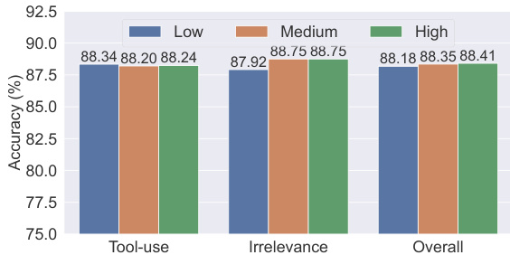 The chart shows the performance of models trained on data of varying complexity levels, with results presented for tool-use, irrelevance, and overall accuracy. Models trained on medium-complexity data achieve the highest accuracy across all categories, indicating that optimal complexity enhances functional calling performance. Models trained on medium-complexity data achieve the highest accuracy in all categories. Accuracy is lower for both low and high complexity data compared to medium complexity. The overall performance trend shows a slight improvement with increasing data complexity up to a medium level.