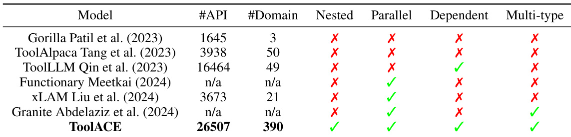 The the the table compares various datasets based on their API count, domain diversity, and inclusion of different data types such as nested, parallel, dependent, and multi-type samples. ToolACE stands out with the highest number of APIs and domains, and it includes all data types, indicating a comprehensive and diverse dataset. ToolACE has the highest number of APIs and domains compared to other datasets. ToolACE includes all data types, while others lack one or more types. The inclusion of diverse data types in ToolACE suggests a more comprehensive training dataset.