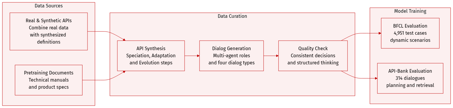 - Dataset Composition and Sources: The authors build a comprehensive API pool combining real API data with synthesized definitions. They extract domain information from pretraining data sources such as technical manuals, product specifications, and tutorials.