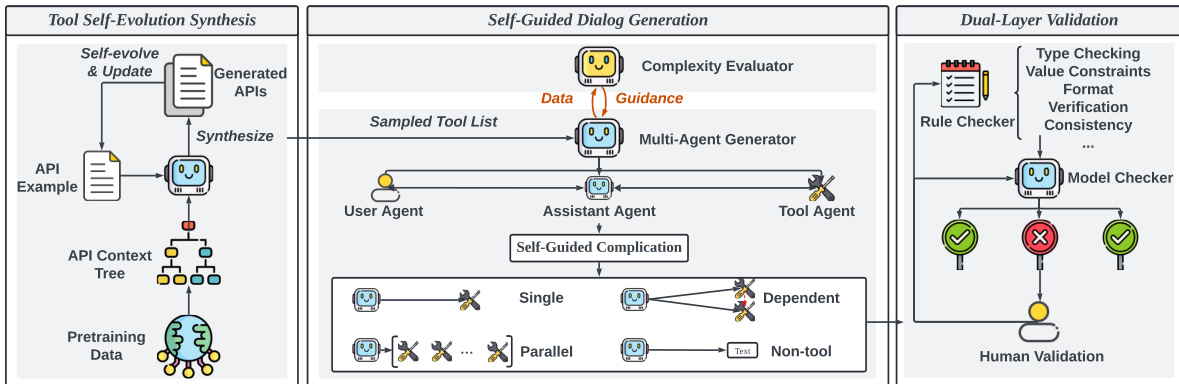 - Dialog Generation: A multi-agent framework simulates user, assistant, and tool roles to produce function-calling dialogs. The system generates four dialog types including single calls, parallel calls, dependent calls, and non-tool-use interactions.