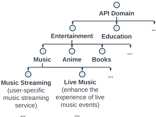 The first module, Tool Self-evolution Synthesis (TSS), is responsible for generating a rich and diverse set of APIs. It operates by recursively evolving a hierarchical API context tree, which is built from pretraining data and structured around an API domain. This tree, as shown in the figure below, organizes APIs into broad categories such as Entertainment and Education, further branching into specific subdomains like Music and Books. The synthesis process uses a self-evolve and update mechanism to iteratively generate new APIs based on existing examples and contextual information, ensuring a broad and representative coverage of tool functionalities.