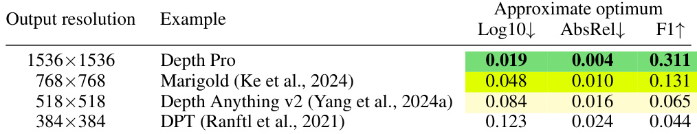 - Runtime efficiency: Depth Pro processes high-resolution images (4K) in under 1 second on a V100 GPU, with less than half the parameters and one-third the runtime of Metric3D v2, while achieving higher native output resolution and better boundary accuracy than variable-resolution models like PatchFusion and ZeroDepth.