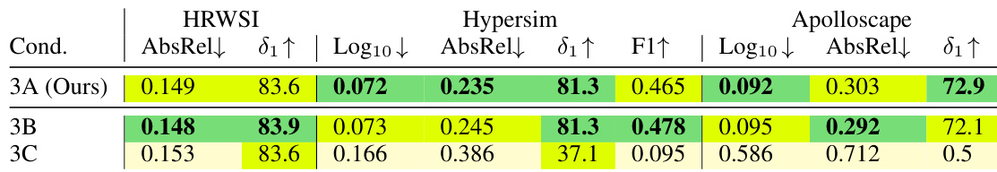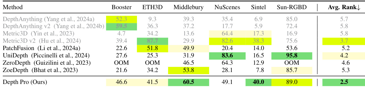 - Zero-shot metric depth estimation: Depth Pro achieves state-of-the-art performance on multiple datasets (Booster, Middlebury, Sun-RGBD, ETH3D, nuScenes, Sintel), attaining the best average rank in Tab. 1 using the δ₁ metric, with superior accuracy compared to leading models including Depth Anything v2, Metric3D v2, and ZoeDepth.
