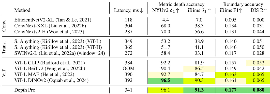 Results show that Depth Pro achieves the highest metric depth accuracy across all datasets, with the best scores in NYUv2 and iBims, while also outperforming all baselines in boundary accuracy, particularly in iBims F1 and DIS R metrics. The model maintains competitive latency, processing images in 341 ms, and demonstrates superior performance compared to other vision transformer-based methods.