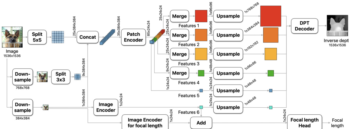 To ensure metric depth predictions, the model includes a dedicated focal length estimation head. This head is a small convolutional network that ingests frozen features from the depth estimation network and task-specific features from a separate ViT image encoder trained for focal length prediction. The head predicts the horizontal angular field-of-view, which is used to scale the canonical inverse depth into a metric depth map. The focal length head is trained separately after the depth estimation network, which avoids the need to balance competing objectives and allows the use of diverse datasets for focal length supervision, including those without depth annotations. This modular design enables the model to produce accurate, scale-aware depth maps even when camera intrinsics are missing or unreliable.