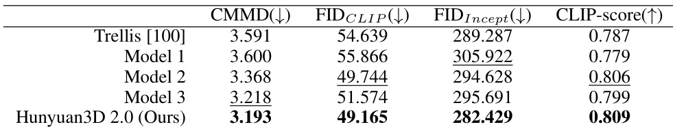 The authors use Hunyuan3D 2.0 to generate textured 3D assets and compare its performance against several baselines using metrics such as CMMD, FIDCLIP, FIDIncept, and CLIP-score. Results show that Hunyuan3D 2.0 outperforms all baselines, achieving the best scores across all metrics, particularly in semantic alignment and detail preservation.