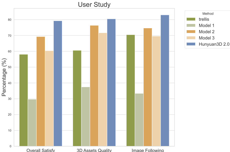 - User study with 50 participants confirms Hunyuan3D 2.0's strong adherence to image conditions and overall visual quality, significantly outperforming baselines in subjective evaluation.
