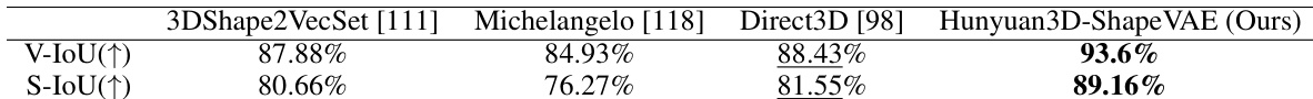 The authors use Table 1 to evaluate the reconstruction performance of Hunyuan3D-ShapeVAE against several baselines using volume IoU (V-IoU) and surface IoU (S-IoU) metrics. Results show that Hunyuan3D-ShapeVAE outperforms all compared methods, achieving the highest scores in both V-IoU and S-IoU, indicating superior shape reconstruction quality.