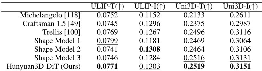 The authors use Table 2 to evaluate the shape generation performance of Hunyuan3D-DiT against several baselines using ULIP-T/I and Uni3D-T/I metrics. Results show that Hunyuan3D-DiT achieves the highest scores across all metrics, indicating it produces the most condition-following results compared to other methods.
