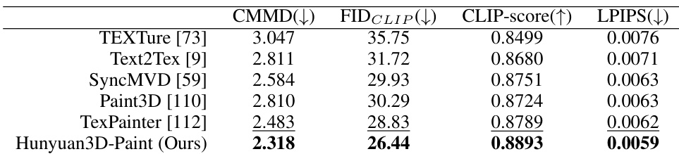 Results show that Hunyuan3D-Paint outperforms all baselines across multiple metrics, achieving the lowest CMMD and FIDCLIP values and the highest CLIP-score and LPIPS scores, indicating superior generative quality, semantic alignment, and detail preservation in texture map synthesis.