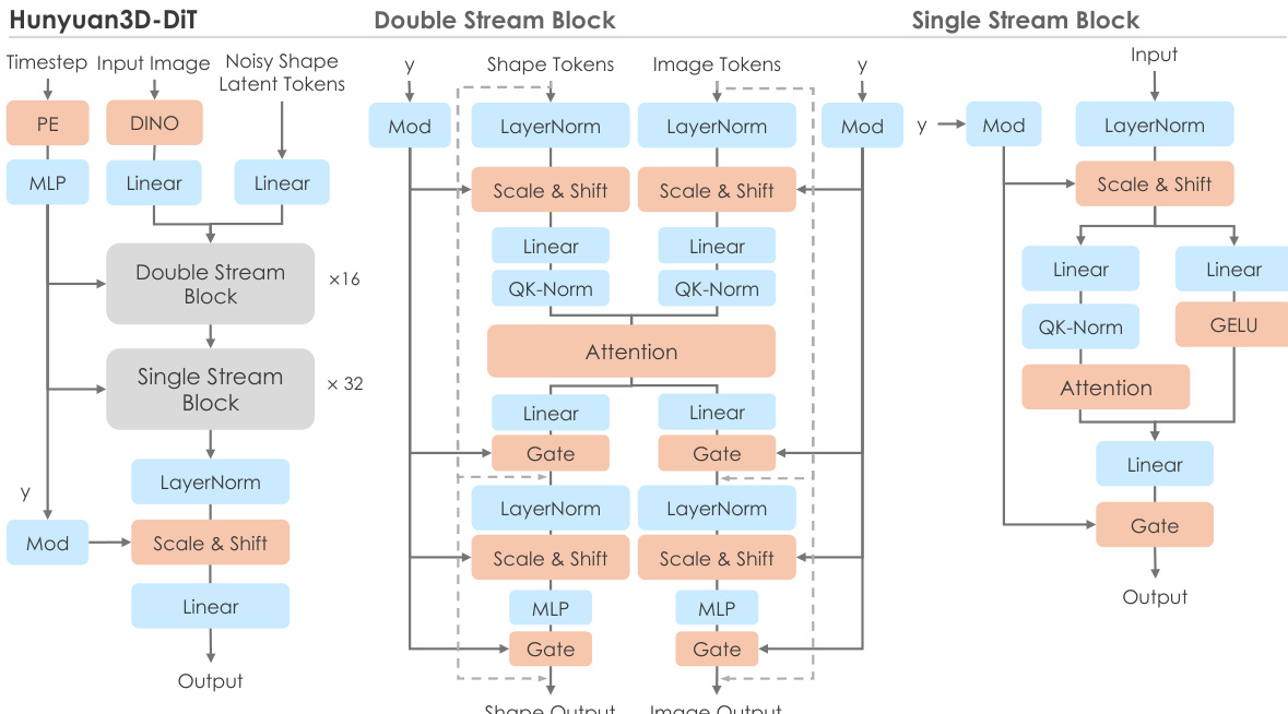 The Hunyuan3D-DiT model, which operates on the latent space defined by the ShapeVAE, is a flow-based diffusion transformer designed to generate high-fidelity 3D shapes conditioned on an input image. The model's architecture, shown in the figure below, employs a dual- and single-stream network structure. The dual-stream blocks process latent tokens (representing the 3D shape) and condition tokens (representing the input image) separately but allow them to interact through attention mechanisms. The single-stream blocks process the concatenated latent and condition tokens in parallel, using spatial and channel attention. The model is conditioned on a pre-trained image encoder, DINOv2, which extracts high-resolution image tokens from the input. To ensure the model focuses on the object of interest, the input image is pre-processed by removing the background, resizing, and centering the object. The training objective is based on flow matching, where the model learns to predict the velocity field that guides a sample from a Gaussian distribution to the data distribution. During inference, the model uses a first-order Euler ODE solver to generate the final shape.