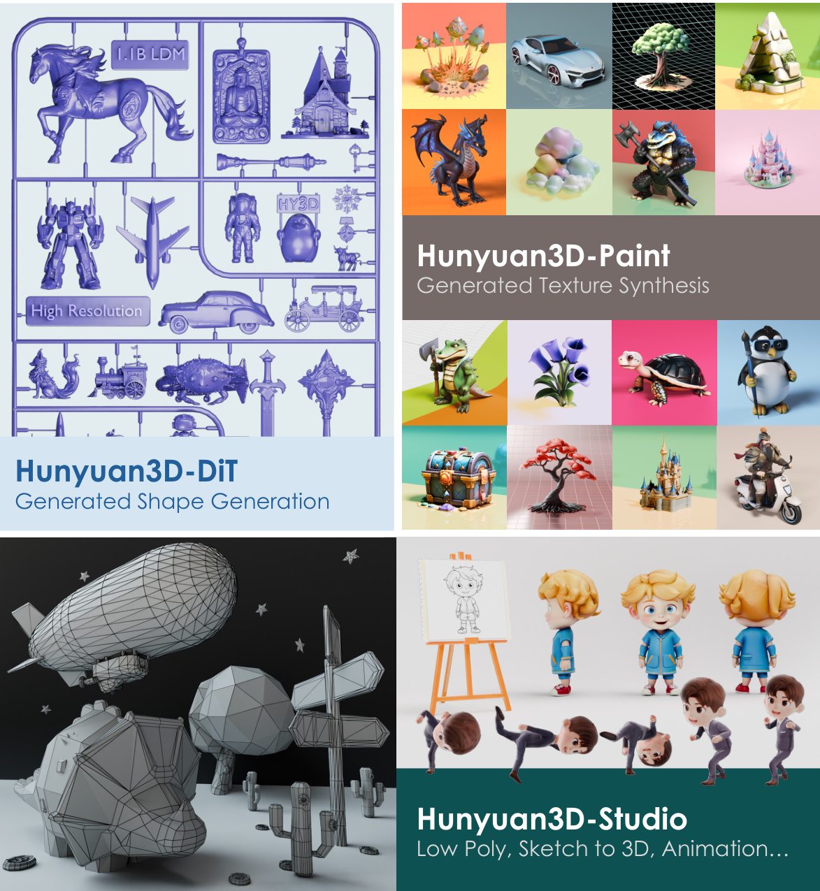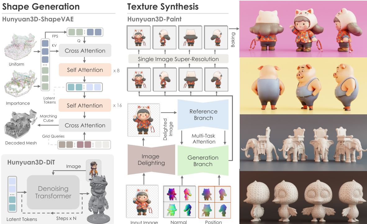 The Hunyuan3D 2.0 system is structured around two primary foundation models: a shape generation model, Hunyuan3D-DiT, and a texture synthesis model, Hunyuan3D-Paint, which together form a pipeline for creating high-resolution textured 3D assets from a single input image. The overall framework, as illustrated in the figure below, begins with the shape generation model, which produces a bare mesh. This mesh is then processed by the texture synthesis model to generate high-fidelity texture maps, which are subsequently baked onto the geometry. The system is further supported by Hunyuan3D-Studio, a production platform that provides tools for downstream applications such as low-polygon stylization and character animation.