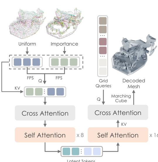 The shape generation model, Hunyuan3D-DiT, is built upon a latent diffusion framework and consists of two key components: the Hunyuan3D-ShapeVAE and the diffusion transformer itself. The ShapeVAE acts as a compressor, transforming a 3D polygon mesh into a sequence of continuous latent tokens. This process begins with the input mesh, from which both uniformly sampled and importance-sampled point clouds are extracted. The importance sampling strategy focuses on capturing high-frequency details, such as edges and corners, by concentrating samples on these complex regions. These point clouds are then encoded into latent tokens using a transformer-based architecture that employs cross-attention and self-attention layers. The encoder's output is a latent shape embedding, which is decoded by a variational decoder to reconstruct the 3D shape as a Signed Distance Function (SDF). This SDF is then converted into a triangle mesh using the marching cube algorithm. The training of the ShapeVAE is supervised by a combination of a reconstruction loss, which measures the mean squared error between the predicted and ground truth SDF, and a KL-divergence loss to ensure a compact and continuous latent space.