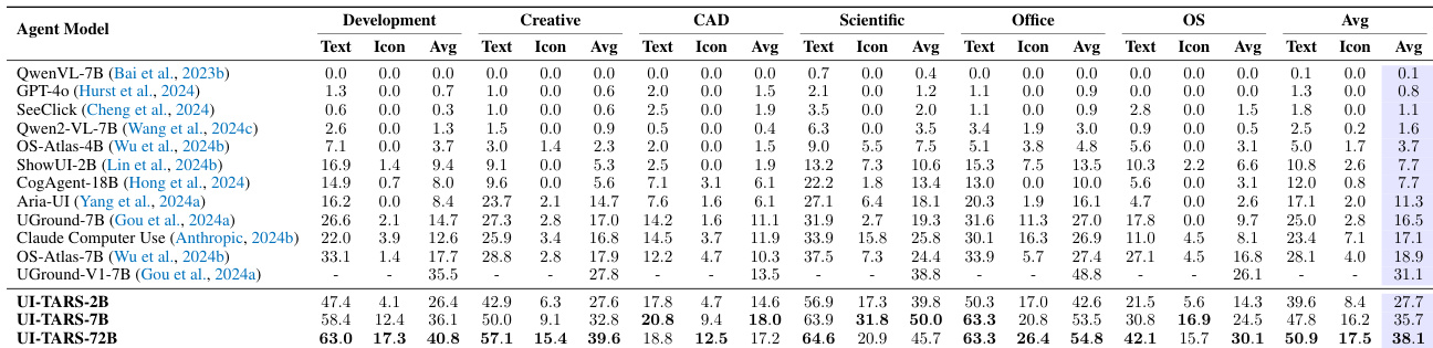 The authors evaluate the performance of the UI-TARS model variants across several specialized domains including Creative, CAD, Scientific, Office, and OS tasks. The results show that the UI-TARS models, particularly the larger 72B version, consistently achieve higher average scores compared to existing baselines across most categories. UI-TARS-72B demonstrates superior performance in the OS and Scientific domains compared to previous models. The model variants show strong capabilities in Office and CAD tasks, outperforming established baselines. Scaling the model size from 2B to 72B leads to significant improvements in average performance across all evaluated categories.