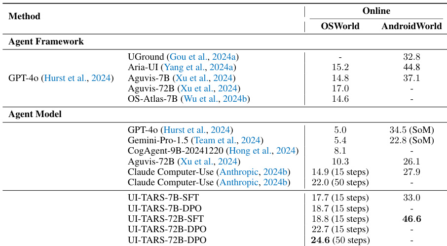 The authors compare the performance of the UI-TARS agent models against various agent frameworks and commercial models in online, dynamic environments. Results across the OSWorld and AndroidWorld benchmarks show that UI-TARS models generally achieve higher scores than existing baselines. UI-TARS models demonstrate superior performance in reasoning-intensive online tasks compared to established agent frameworks and commercial models. The 72B variant of UI-TARS achieves higher scores in both desktop and mobile environments than previous state-of-the-art methods. Applying Direct Preference Optimization (DPO) to the UI-TARS models leads to improved results in online benchmark settings.