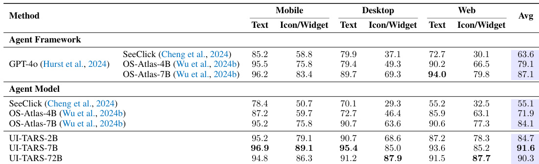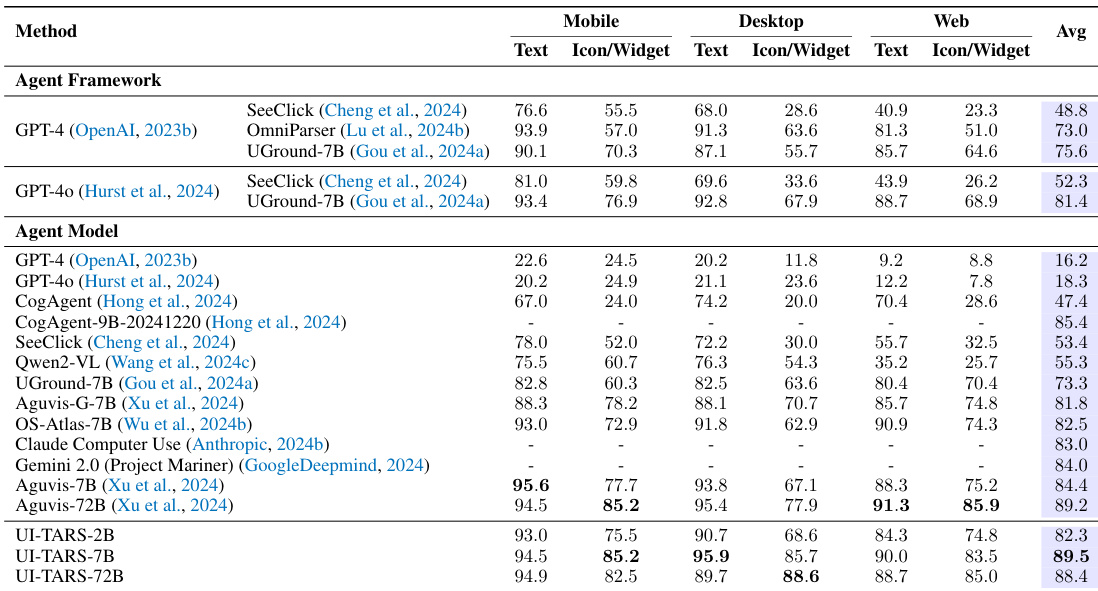 The the the table compares various agent frameworks and agent models across mobile, desktop, and web platforms. Results show that the UI-TARS models, particularly the larger variant, achieve superior performance across most categories compared to existing frameworks and models. The UI-TARS-72B model achieves the highest average performance among all evaluated methods. UI-TARS models demonstrate strong capabilities across mobile, desktop, and web environments, often outperforming commercial and academic baselines. In many categories, the UI-TARS-72B model shows significant improvements over both modular agent frameworks and end-to-end agent models.