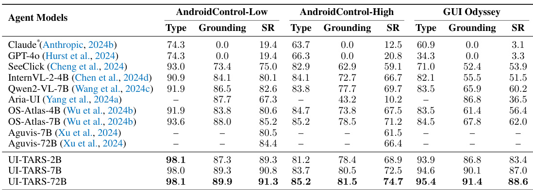 The authors evaluate several agent models across mobile-based benchmarks including AndroidControl and GUI Odyssey. Results show that the UI-TARS models consistently achieve higher performance in both grounding and success rates compared to existing baselines. UI-TARS-72B achieves superior performance in both low and high complexity AndroidControl tasks. The UI-TARS models demonstrate improved grounding and success rates in GUI Odyssey compared to previous state-of-the-art methods. Scaling from the 2B to the 72B variant leads to measurable improvements in task execution and grounding precision.