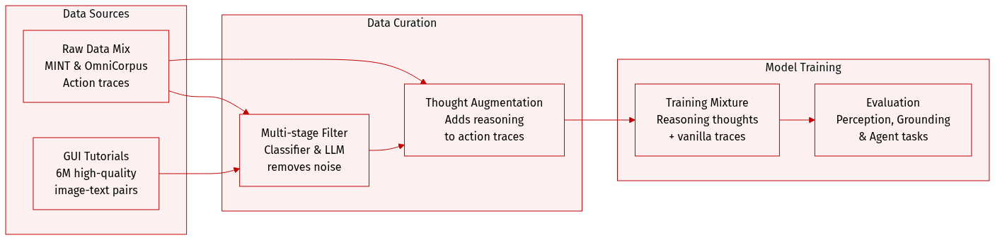 - GUI Tutorials: The authors curate approximately 6M high-quality tutorials from the MINT and OmniCorpus image-text interleaved datasets. On average, each tutorial consists of 3.3 images and 510 text tokens.