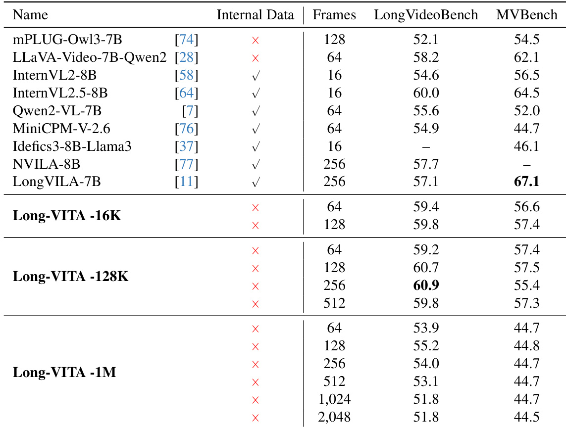 The authors evaluate the performance of Long-VITA models across different sequence lengths using LongVideoBench and MVBench. Results show that the model maintains strong video understanding capabilities across various frame counts and temporal lengths. Long-VITA-128K achieves leading performance on LongVideoBench, particularly at higher frame counts. The Long-VITA series demonstrates competitive results on MVBench across multiple frame configurations. Long-VITA-1M maintains consistent performance even when processing a significantly larger number of frames.
