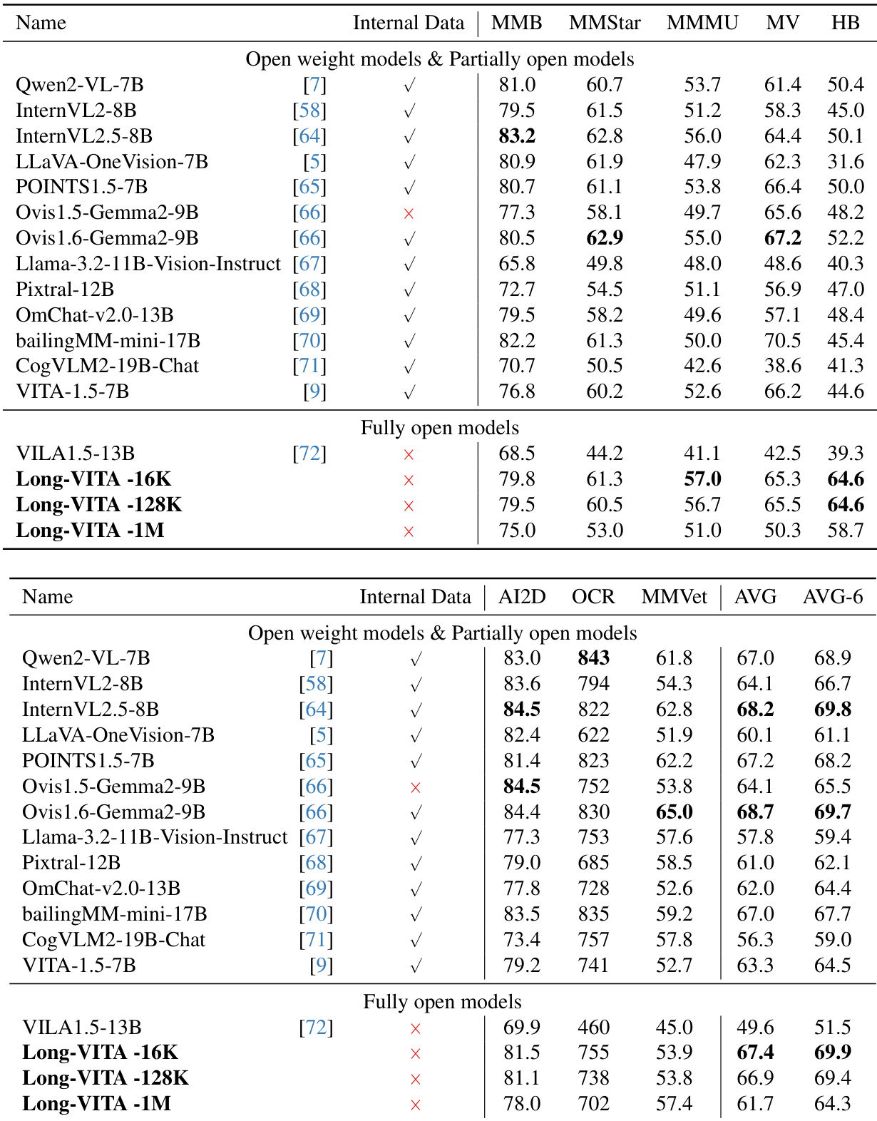 The authors compare Long-VITA models against various open weight and partially open models across multiple multimodal benchmarks. Results show that Long-VITA models achieve competitive performance on image and video understanding tasks using only open source data. Long-VITA-16K demonstrates superior performance on several image benchmarks compared to other models in the same parameter range The Long-VITA model series achieves high average scores across both objective and general multimodal evaluation collections Long-VITA models maintain strong capabilities in tasks involving visual reasoning and OCR