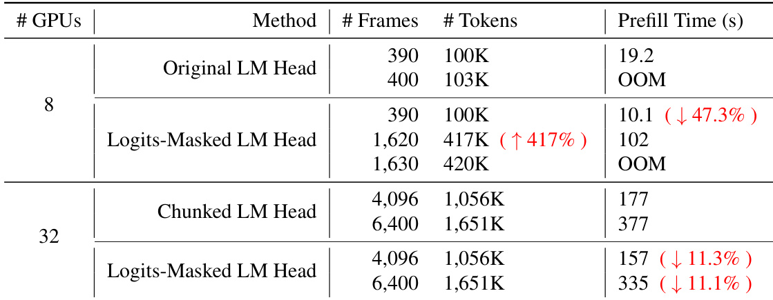 The authors compare different language modeling head designs to evaluate their impact on sequence length capacity and inference speed. The results demonstrate that the logits-masked LM head significantly improves the maximum supported tokens and reduces prefill time compared to the original method. The logits-masked LM head enables a much higher number of tokens before encountering out-of-memory errors compared to the original LM head The logits-masked LM head reduces prefill time relative to the original LM head The logits-masked LM head provides a speedup in prefill time when compared to the chunked LM head at higher token counts
