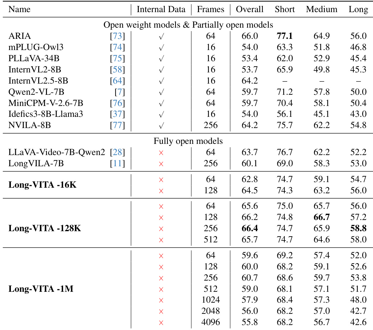 The authors compare the performance of Long-VITA models against various open-weight, partially open, and fully open models on the LongVideoBench benchmark. The results demonstrate that Long-VITA models maintain strong video understanding capabilities across different temporal lengths, specifically within short, medium, and long context categories. Long-VITA-128K achieves competitive or superior performance in medium and long context video understanding compared to other models in its parameter class. The Long-VITA series shows robust performance across varying frame counts, ranging from short to long video sequences. Long-VITA models perform strongly on long-form video tasks without relying on internal or proprietary training data.