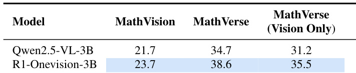 The authors use the Qwen2.5-VL-3B model as a base to evaluate the effectiveness of their R1-Onevision approach. Results show that R1-Onevision-3B achieves higher accuracy than the base model across all three benchmarks, with improvements of 2.0, 3.9, and 4.3 percentage points on MathVision, MathVerse, and MathVerse (Vision Only), respectively.