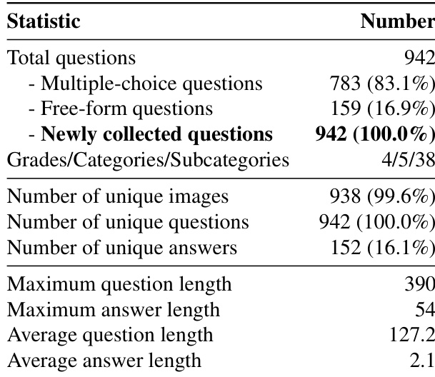 The authors present a comprehensive analysis of the R1-Onevision benchmark, which consists of 942 total questions, including 783 multiple-choice and 159 free-form questions, all newly collected. The benchmark is structured across four difficulty grades and five academic categories, with a focus on evaluating multimodal reasoning capabilities through a diverse set of unique images, questions, and answers.