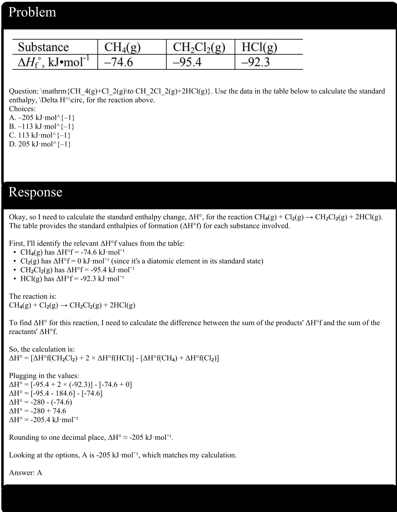 The authors use a table of standard enthalpies of formation to calculate the standard enthalpy change for a chemical reaction, applying the formula ΔH° = ΣΔH°f(products) - ΣΔH°f(reactants). The model correctly identifies the relevant values, performs the calculation step-by-step, and arrives at the answer -205.4 kJ·mol⁻¹, which matches option A.