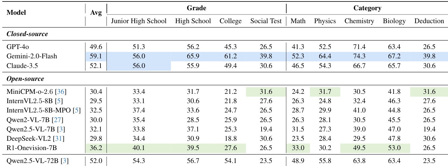 - R1-Onevision achieves state-of-the-art performance on multimodal reasoning benchmarks, outperforming models like GPT-4o and Qwen2.5-VL, and is evaluated using R1-Onevision-Bench, a new benchmark aligned with human educational levels from junior high to university.