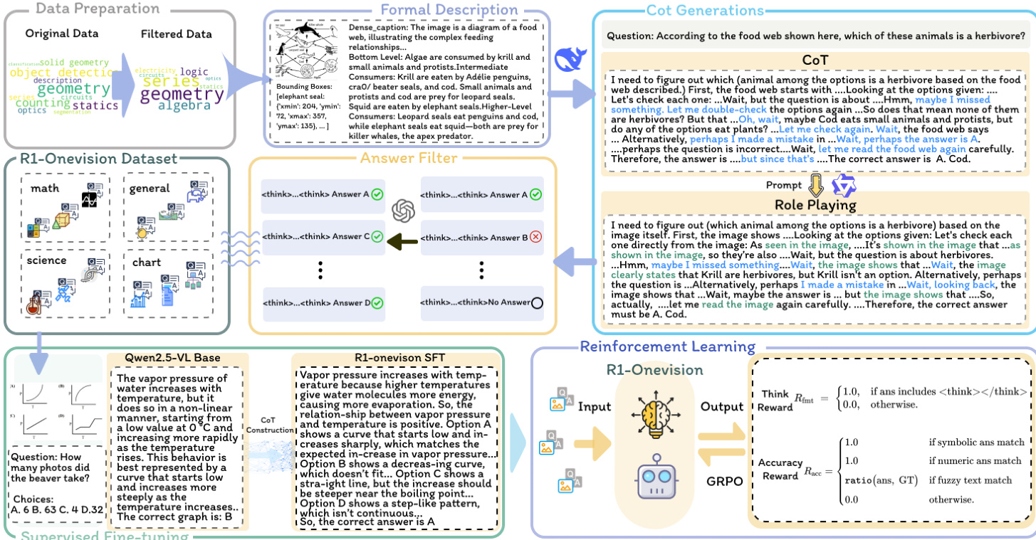 - The authors introduce a cross-modal reasoning pipeline that converts images into formal textual representations, enabling precise, step-by-step reasoning, and construct the R1-Onevision dataset with detailed, annotated reasoning traces across diverse domains.