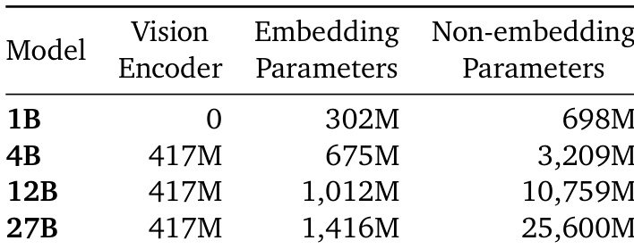 The authors use a vision encoder with 417 million parameters for models larger than 1B, while the 1B model does not use a vision encoder. As model size increases, both embedding and non-embedding parameters grow significantly, with the 27B model having 1.4 billion embedding parameters and 25.6 billion non-embedding parameters.