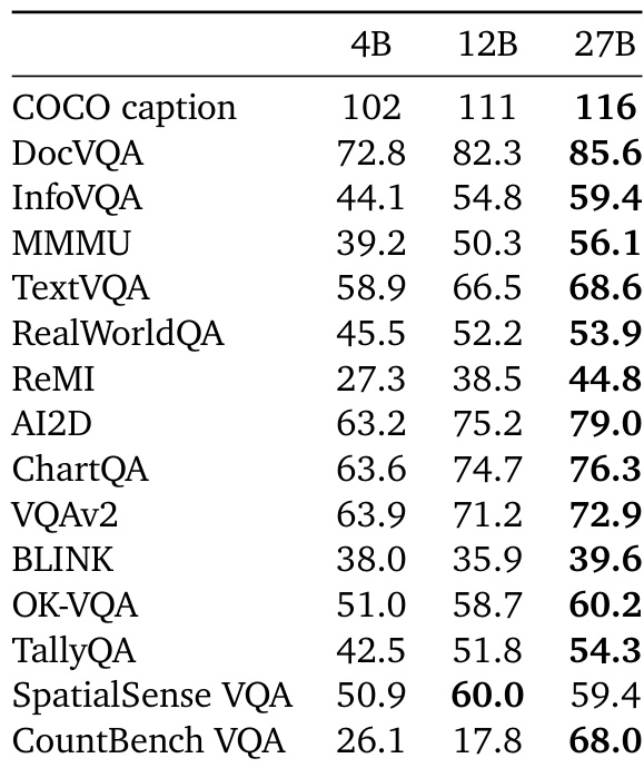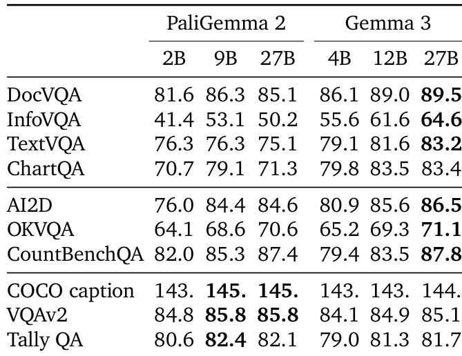 The authors compare the performance of PaliGemma 2 and Gemma 3 models across various vision and language benchmarks, showing that Gemma 3 models consistently outperform PaliGemma 2 across most tasks, with the 27B Gemma 3 model achieving the highest scores in several categories. Results indicate that the improvements in Gemma 3 are particularly notable in vision-language tasks such as DocVQA and TextVQA, where the 27B model achieves a score of 89.5 and 83.2 respectively, surpassing all PaliGemma 2 variants.