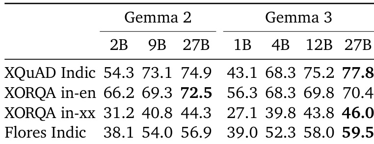 The authors compare the performance of Gemma 2 and Gemma 3 models across several benchmarks, showing that Gemma 3 models generally outperform Gemma 2 models. Specifically, Gemma 3 27B achieves the highest score on XQuAD Indic and XORQA in-xx, while Gemma 3 1B and 4B show improvements over their Gemma 2 counterparts on most tasks.