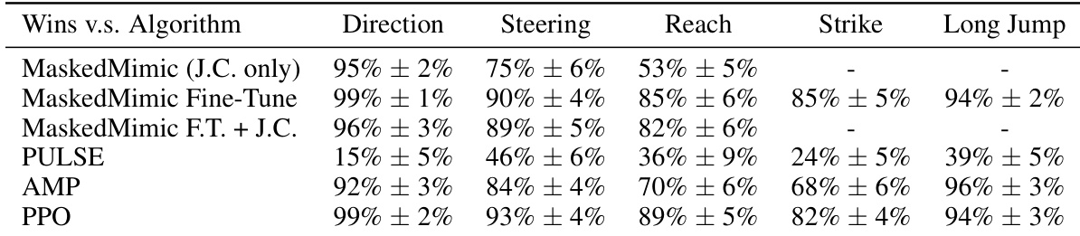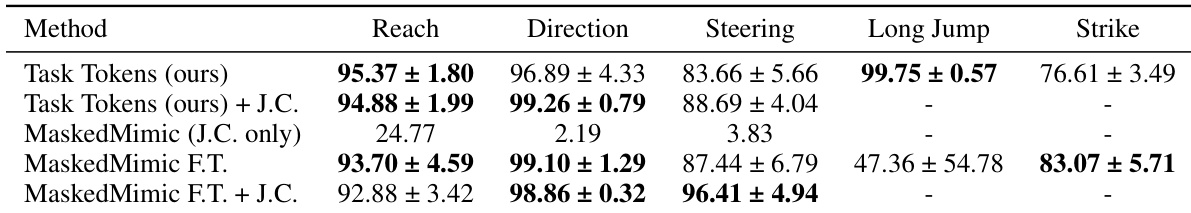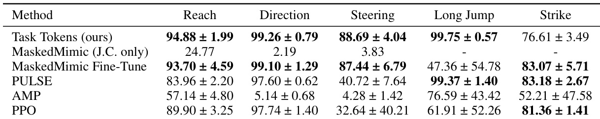 The authors compare the Task Tokens approach against several baselines across five humanoid control tasks. Results show that Task Tokens achieves high success rates in most environments, demonstrating effective task adaptation while maintaining competitive performance against specialized methods. Task Tokens achieves superior success rates in the Reach, Direction, and Steering tasks compared to most baselines. The method performs highly effectively on the Long Jump task, matching the performance of state-of-the-art hierarchical approaches. While other methods like MaskedMimic Fine-Tune and PULSE show strong results in the Strike task, Task Tokens remains highly competitive across the task suite.