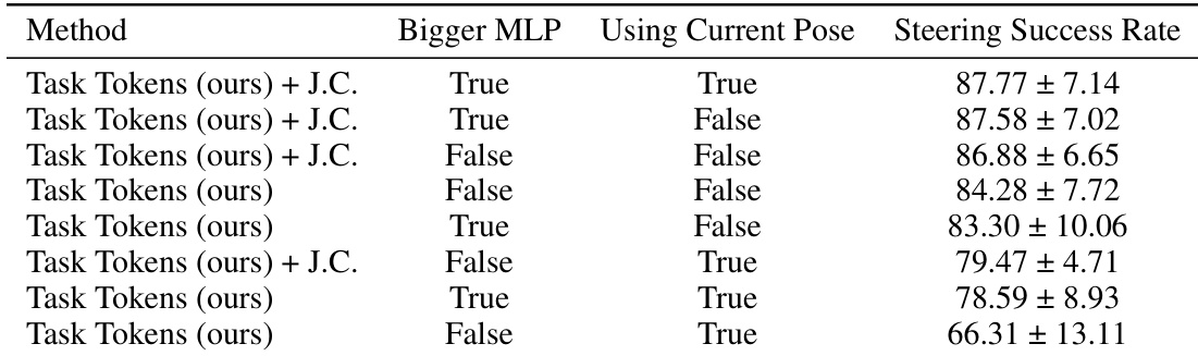 The authors conduct an ablation study to evaluate how different Task Encoder architectures affect performance on the steering task. The results demonstrate that larger MLP encoders and the inclusion of current pose information generally contribute to higher success rates. Using a bigger MLP encoder tends to improve the success rate in steering tasks. Incorporating current pose information into the encoder leads to better performance when using a larger MLP. The combination of a larger MLP and current pose information yields the highest success rate among the tested configurations.