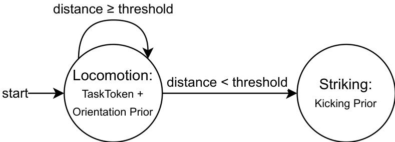 For complex tasks that require sequential execution, the authors implement multi-phase prompting. This mechanism uses a finite-state machine (FSM) to switch between different prior tokens while using a single Task Token. As shown in the figure below, this allows the agent to transition between distinct behavioral phases, such as moving from a locomotion phase to a striking phase, based on geometric proximity to a target: