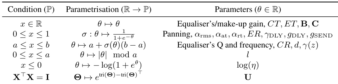 The model's total parameter count is 152, which is significantly reduced compared to more expressive models, prioritising a compact representation for analysis. The parameters are parametrised using specific functions to ensure they remain within their valid ranges. The training process optimises the effects parameters by minimising a composite loss function. This loss combines a multi-scale STFT (MSS) loss, which matches the magnitude spectrograms of the predicted and ground-truth signals across three scales, and a multi-scale Loudness Dynamic Range (MLDR) loss, which matches the microdynamics of the signals by comparing their loudness dynamics at different integration times. A regularisation term on the surrogate variable η\etaη is also included to encourage the damped sinusoidal approximation to converge to the unit circle. The final loss is a weighted sum of these components, applied to the left, right, mid, and side channels of the stereo output.