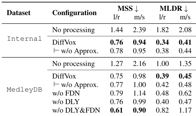 • DiffVox, the complete model incorporating spatial effects (PEQ, compressor, delay, FDN), achieves the best sound matching performance on MedleyDB, with the lowest MLDR loss and lower MSS than configurations with only delay or FDN, validating the importance of spatial effects for accurate microdynamic and spectral matching.