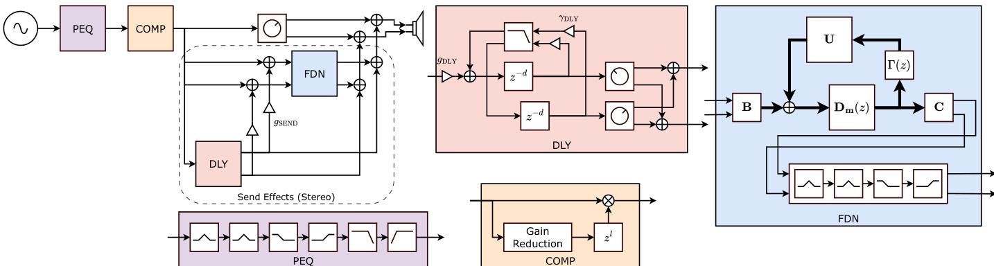 The ping-pong delay (DLY) is implemented with two delay lines that alternate between left and right channels, each with its own panner and a low-pass filter in the feedback path. The delay time is learned using a frequency-sampling approach, representing the effect as a convolution with a finite impulse response. The feedback delay network (FDN) reverb uses a stereo network of six delay lines with co-prime delay times. The FDN's transfer function is approximated using frequency-sampling, with a frequency-dependent attenuation filter parametrised by sampling its magnitude response at 49 points. A post-reverb PEQ is applied to the impulse response to correct for frequency-dependent decay and initial gain. The model also includes effect sends, where the delayed signal is sent to the reverb to colourise it, controlled by a send level parameter.