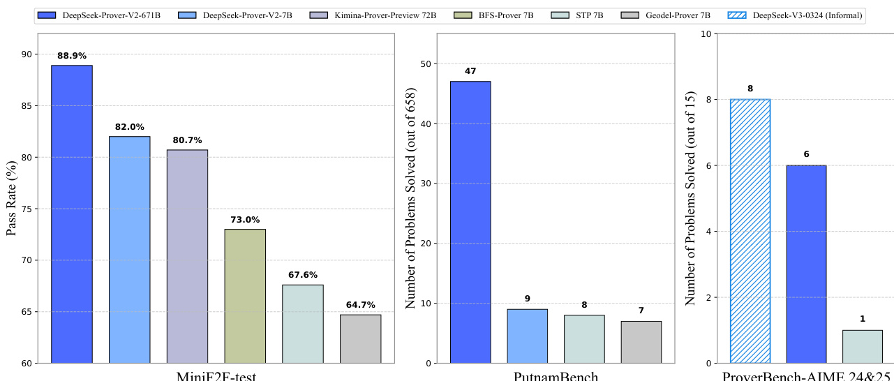 - On ProverBench, DeepSeek-Prover-V2-671B achieved strong results on both the full set (325 problems) and the AIME 24&25 subset, demonstrating competitive performance against state-of-the-art provers.