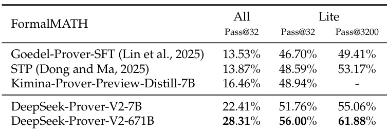 - On FormalMATH-Lite, DeepSeek-Prover-V2-671B achieved 56.00% success rate with 32 samples and improved to 61.88% with 3200 samples, outperforming prior models including Goedel-Prover-SFT, STP, and Kimina-Prover-Preview-Distill-7B; on the full FormalMATH-All dataset, it solved 28.31% of problems.
