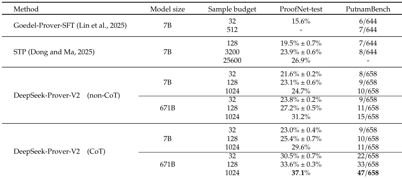 Results show that DeepSeek-Prover-V2 achieves strong performance across multiple benchmarks, with the 671B model outperforming other methods in both ProofNet-test and PutnamBench. The CoT version of DeepSeek-Prover-V2 significantly improves results, particularly on PutnamBench, where the 671B model reaches 47/658, demonstrating the effectiveness of chain-of-thought reasoning.