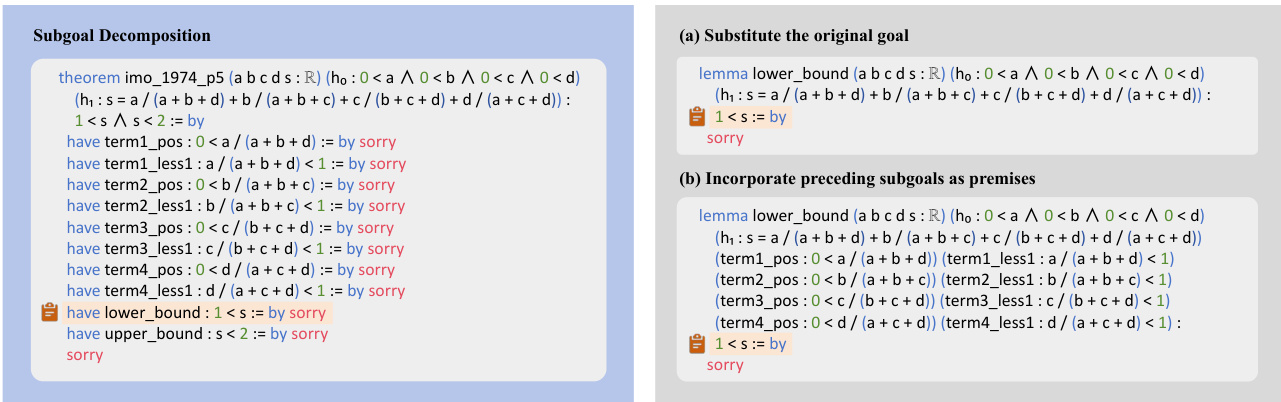 The authors address the challenge of bridging informal mathematical reasoning in large language models (LLMs) with the syntactic rigor required for formal theorem proving in systems like Lean. While LLMs excel at natural language chain-of-thought reasoning, their heuristic-driven, approximate style lacks the precision needed for formal verification, where every step must be explicitly justified. Prior approaches attempted to close this gap using proof sketches to guide formal proof construction, but struggled with sparse training signals and inefficient proof search. To overcome these limitations, the authors introduce DeepSeek-Prover-V2, which leverages a two-stage pipeline: first, a large general-purpose model (DeepSeek-V3) generates high-level proof sketches and recursively decomposes complex theorems into subgoals formalized in Lean, with intermediate steps left as sorry placeholders; second, a smaller 7B prover model resolves these subgoals recursively, enabling efficient proof search. The authors further enhance training by constructing a curriculum of increasingly difficult conjectures derived from subgoals, creating dense, high-quality training data. This cold-start data is then refined via reinforcement learning, significantly improving the model’s ability to solve formal proofs. The resulting DeepSeek-Prover-V2-671B achieves state-of-the-art performance on benchmarks including MiniF2F, ProofNet, and PutnamBench, and successfully solves challenging AIME problems, demonstrating strong generalization and reasoning capabilities.