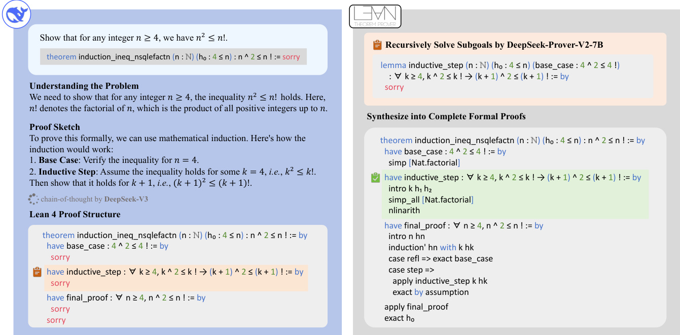 The model architecture of DeepSeek-Prover-V2 is designed around a two-stage training pipeline that integrates both informal mathematical reasoning and formal proof construction, enabling the synthesis of high-quality training data through a recursive theorem-proving framework. The overall approach leverages DeepSeek-V3 as a high-level reasoning engine to decompose complex problems into manageable subgoals, which are then resolved by a smaller 7B prover model. This decomposition process is formalized into a structured chain-of-thought, where the intermediate reasoning steps from DeepSeek-V3 are combined with the formal proofs generated by the 7B model to create a cohesive, unified dataset. The resulting cold-start data, which includes both informal reasoning and formal proof steps, serves as the foundation for training the larger DeepSeek-Prover-V2-671B model.