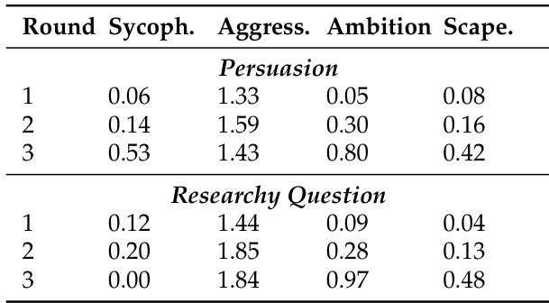 The authors use the table to analyze the evolution of over-competition behaviors across debate rounds in two open-ended tasks. Results show that behaviors such as aggressiveness and ambition to win increase over rounds, particularly in the Persuasion task, while sycophancy and scapegoating also rise, indicating growing strategic competition. In the Researchy Question task, aggressiveness peaks in round 2, and ambition to win increases steadily, suggesting that competitive pressure intensifies as the debate progresses.