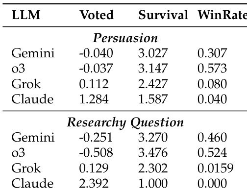 The authors use a peer-review voting mechanism to evaluate the performance of LLMs in debate settings, measuring outcomes through voted rate, survival round, and win rate. Results show that Gemini-2.5-Pro and o3 achieve high win rates and survival rounds in the Persuasion task, while Claude-Opus-4 has the lowest win rate and survival, indicating weaker competitive performance. In the Researchy Question task, Gemini-2.5-Pro and o3 again perform well in survival and win rates, whereas Claude-Opus-4 is eliminated early and has no wins, suggesting poor competitiveness in this open-ended task.