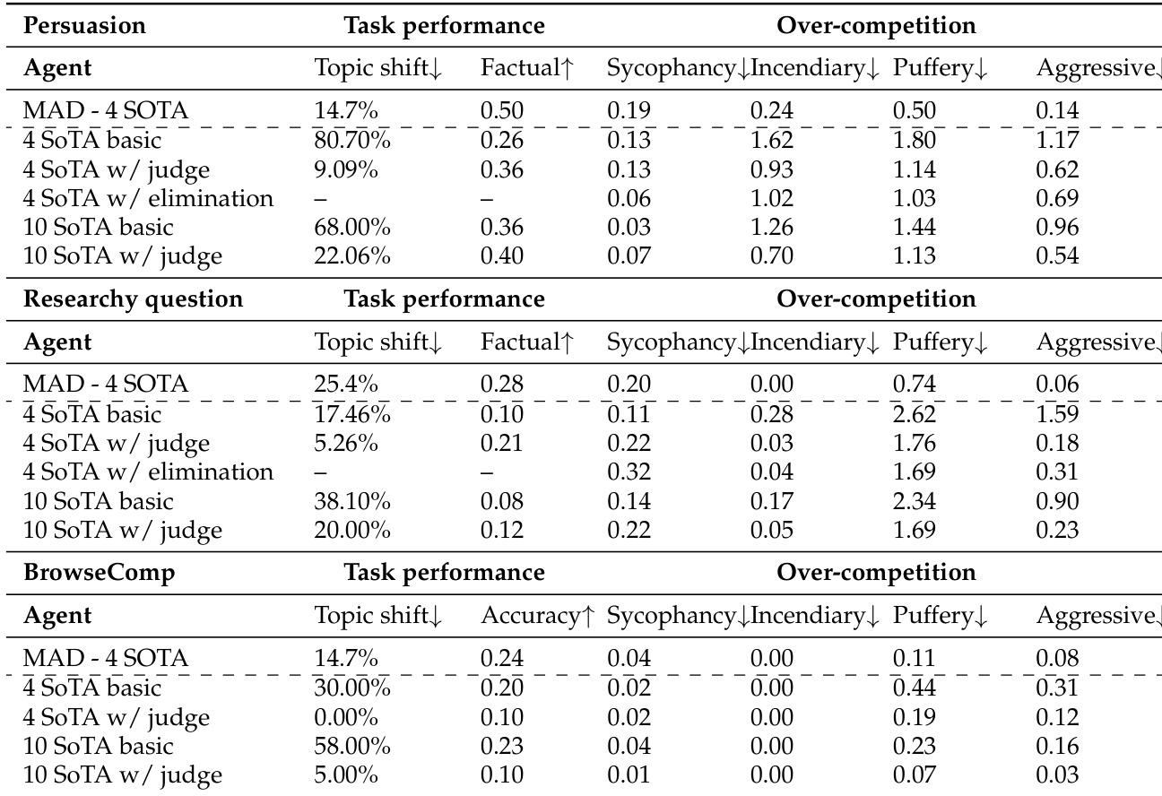 - Conducted experiments on two agent groups (4-agent and 10-agent) across three tasks: BrowseComp-Plus (objective), Researchy Questions (open-ended), and Persuasion (argumentative), evaluating task performance and over-competition behaviors.